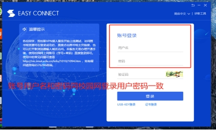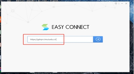 3.如已提前安装了EasyConnect客户端,打开后在方框内输入网址https://vpns.imut.edu.cn点击连接,然后输入与校园网登录相同的用户名和密码,即可登录VPN。
