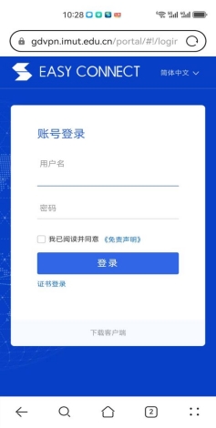 2.通过手机应用市场下载EasyConnect客户端app,安装后打开app,在登录界面的文本框内输入网址访问https://vpns.imut.edu.cn,然后输入与校园网登录相同的用户名和密码,即可登录移动(手机)端VPN。登录成功后,您将能够访问校内资源。