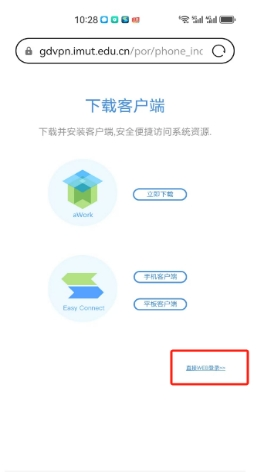 1.使用手机浏览器访问https://vpns.imut.edu.cn,点击“直接web登录”,输入用户名和密码进行访问。登录后,您将能够访问校内资源。